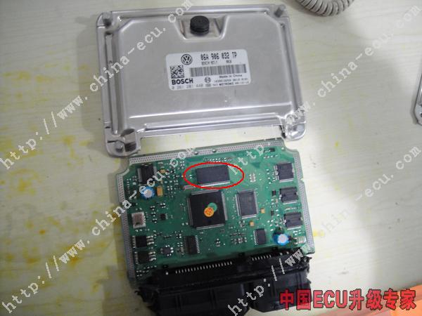 由于设计原因,途安1.8T升级ECU需要把ECU电脑拆下来,利用编程器在线读写FLASH。下面是打开后的途安1.8T的ECU电脑,红圈所示既是本次要进行读写的FLASH。